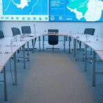 Sala de torneio de xadrez em Brasília com tabuleiros e peças dispostas em mesas, ao fundo arquitetura moderna da capital.